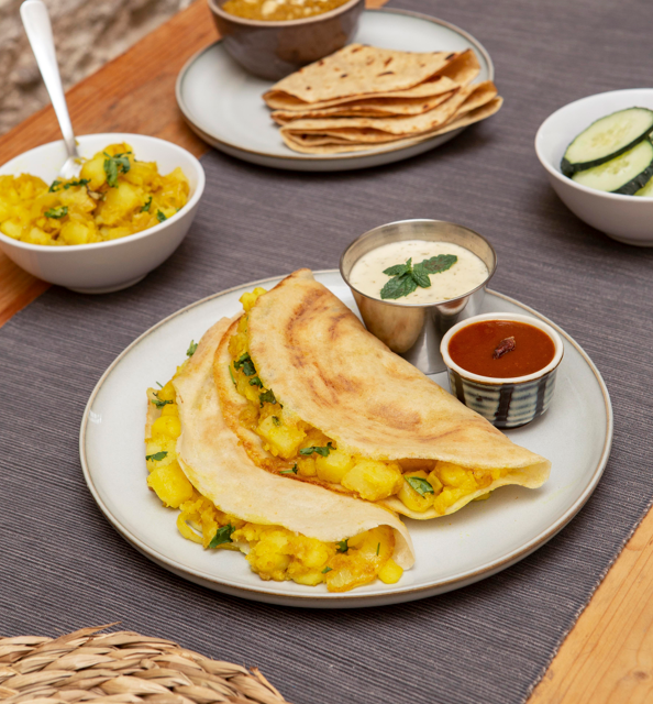 - Fold the dosa over the filling and serve hot with chutneys and sambar.